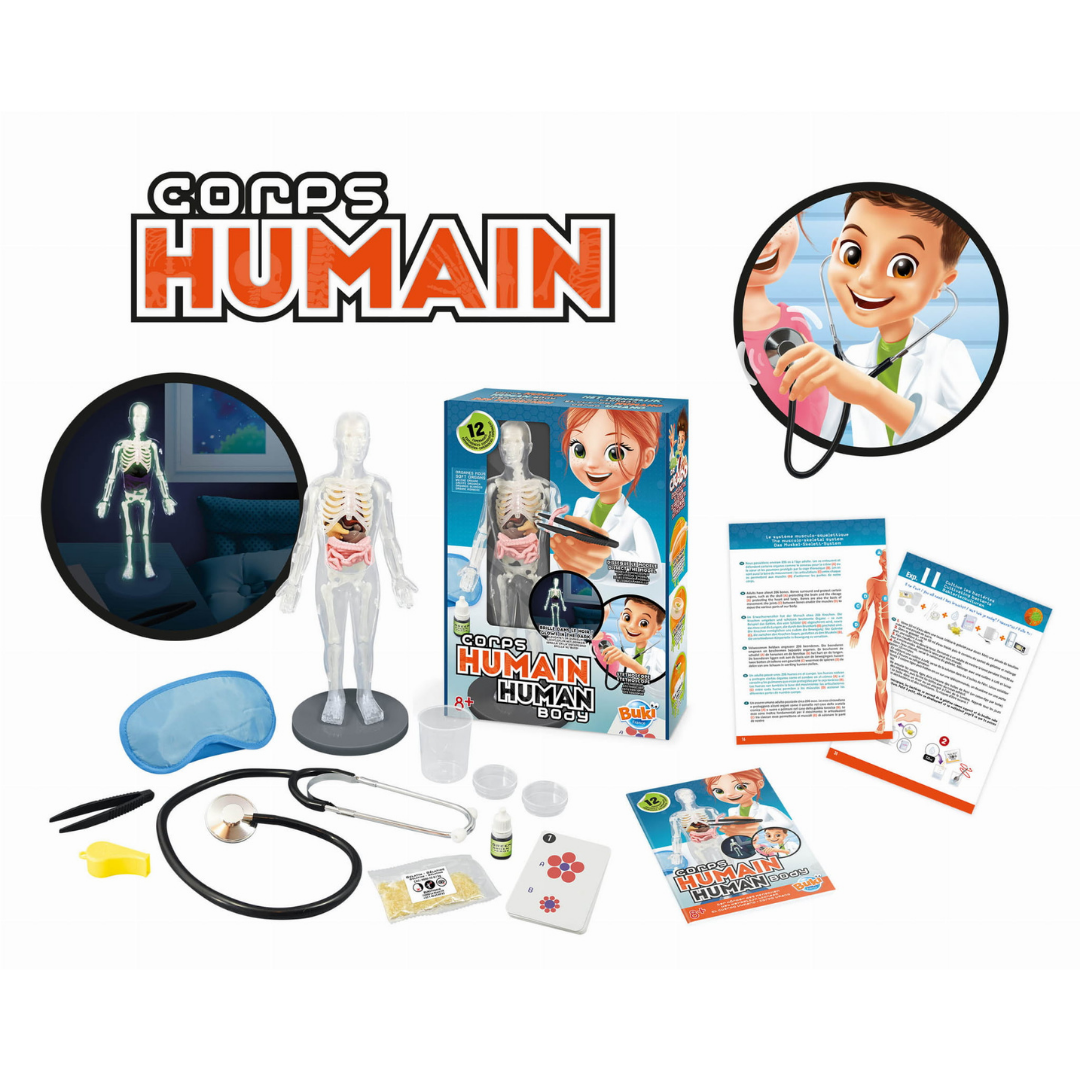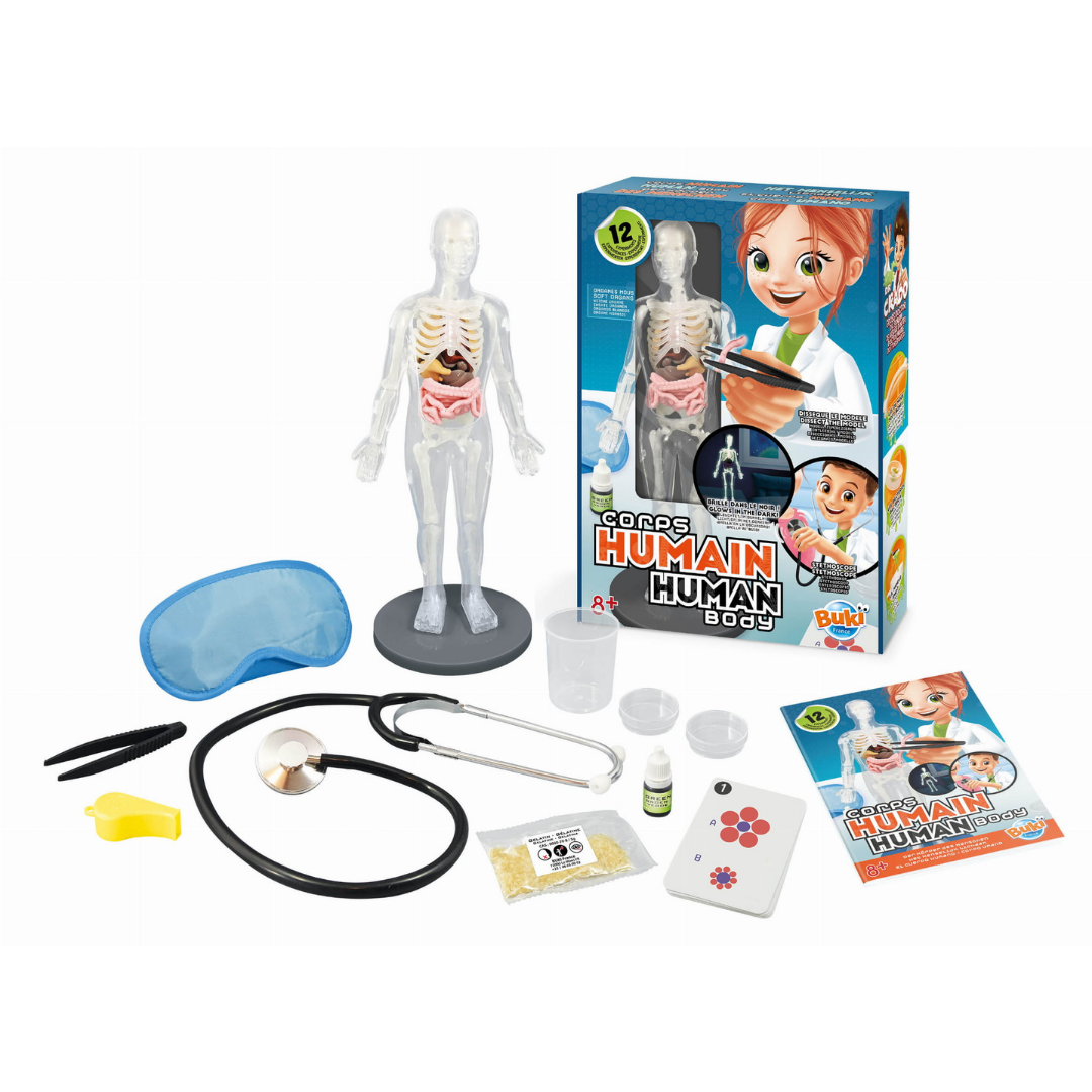 Zestaw Ciało człowieka od Buki France to wyjątkowa propozycja dla młodych odkrywców, którzy chcą zgłębiać tajemnice ludzkiej anatomii i biologii. Model składa się z 9 organów z miękkiego tworzywa, szkieletu z 12 elementów oraz przezroczystej obudowy i podstawy. Organy można wyjmować, a kości – po krótkiej ekspozycji na światło – świecą w ciemności nawet przez godzinę!