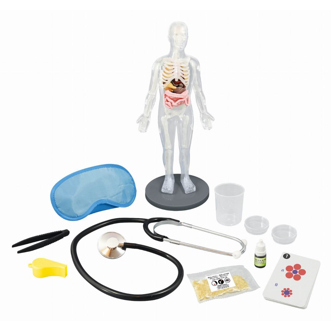 Zawartość: model ludzkiego ciała, 9 organów, szkielet (12 elementów), 3 szalki Petriego, 10 kart iluzji, gwizdek, stetoskop, opaska na oczy, szczypce