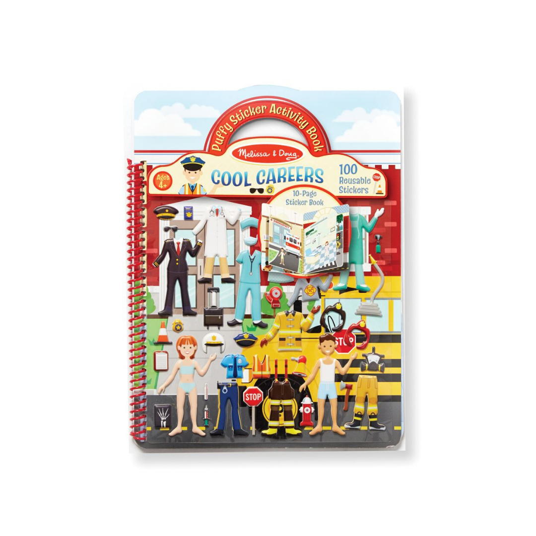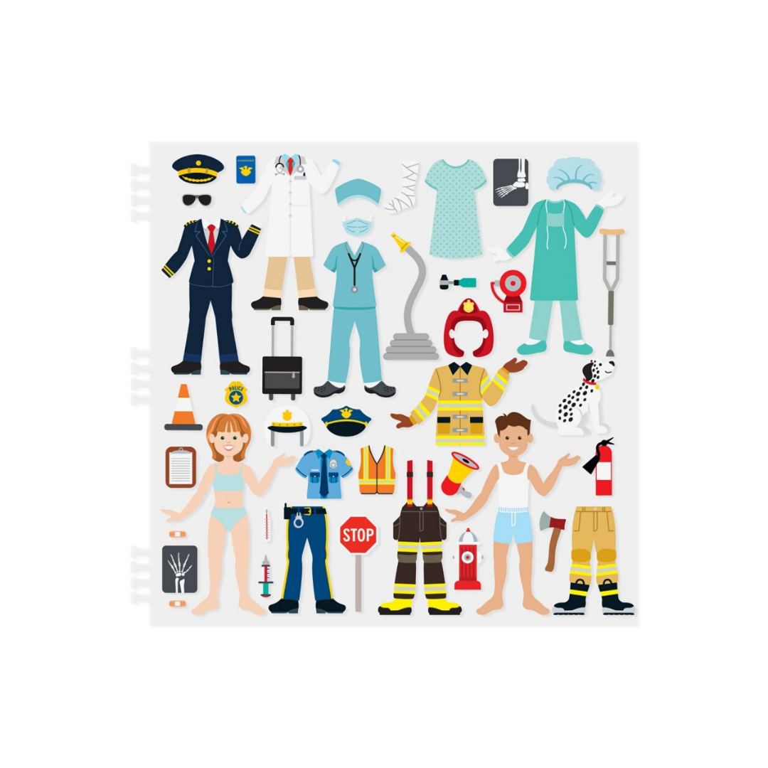 Wypukłe naklejki wielokrotnego użytku oraz książeczka z 10 stronami z motywem zawodów. W książce znajdziemy różne scenerie w zależności od wykonywanego zawodu (lekarz, strażak, policjant, nauczyciel), które można dekorować na wiele różnych sposobów. W zestawie znajdziemy aż 100 wypukłych naklejek, są to między innymi elementy ubioru czy elementy odpowiadające danej aktywności.