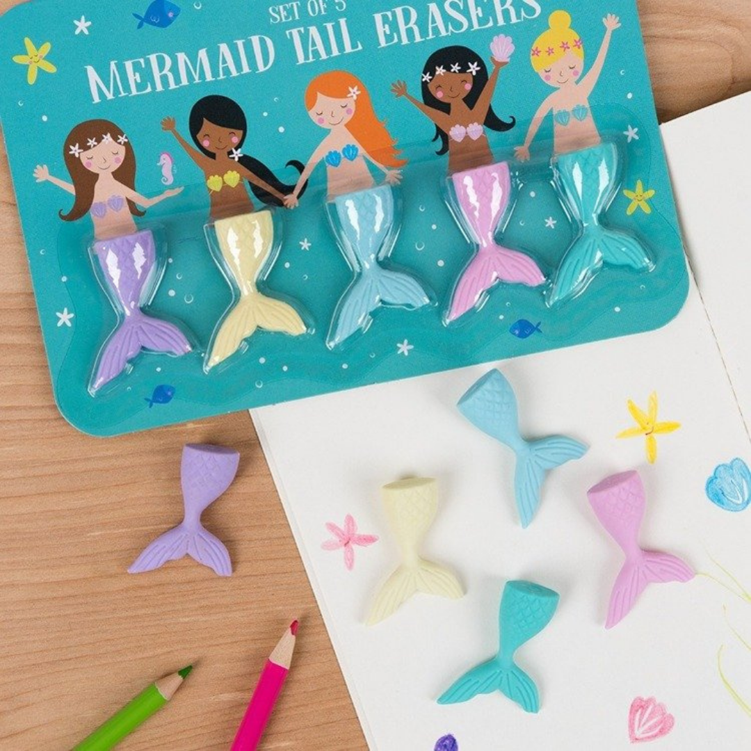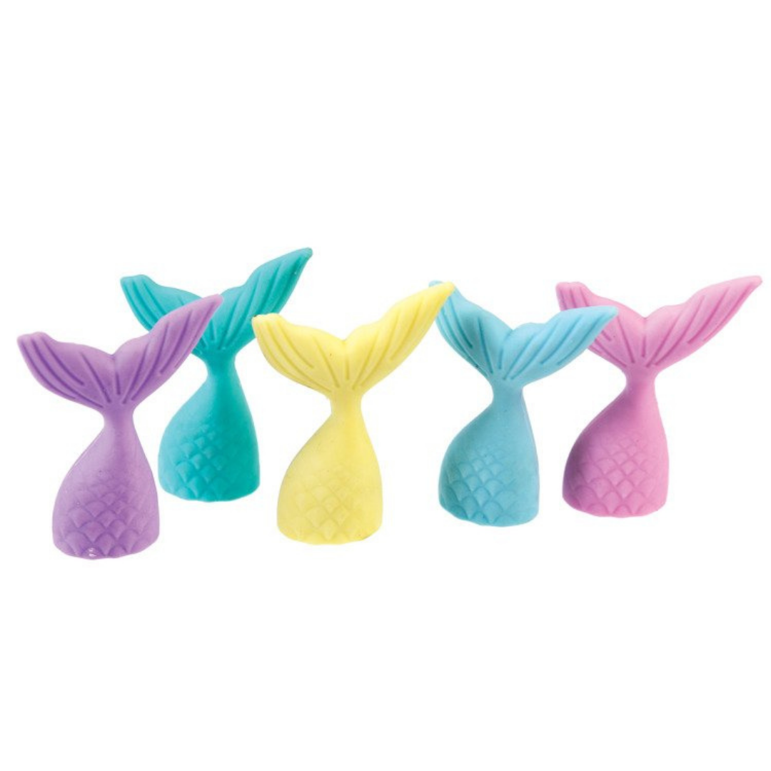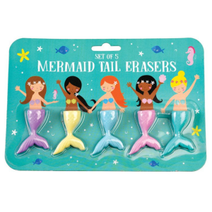 Urocze gumki do zmazywania, w postaci syrenich ogonów. W zestawie znajduje się aż 5 gumek w kolorze fioletowym, żółtym, niebieskim, różowym oraz turkusowym.