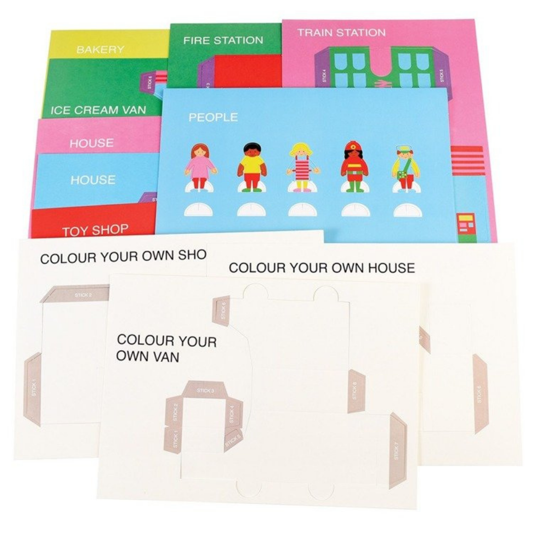 Zestaw kartonowe miasteczko zawiera 3 szablony 7 kolorowych budynków, 3 szablony do samodzielnego pokolorowania oraz 5 szablonów postaci. Zestaw nie wymaga użycia kleju.