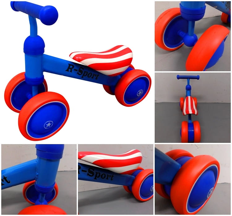 - Trójkołowa konstrukcja - dwie koła z przodu i jedno podwójne z tyłu, zapewniające stabilność i bezpieczeństwo podczas nauki.