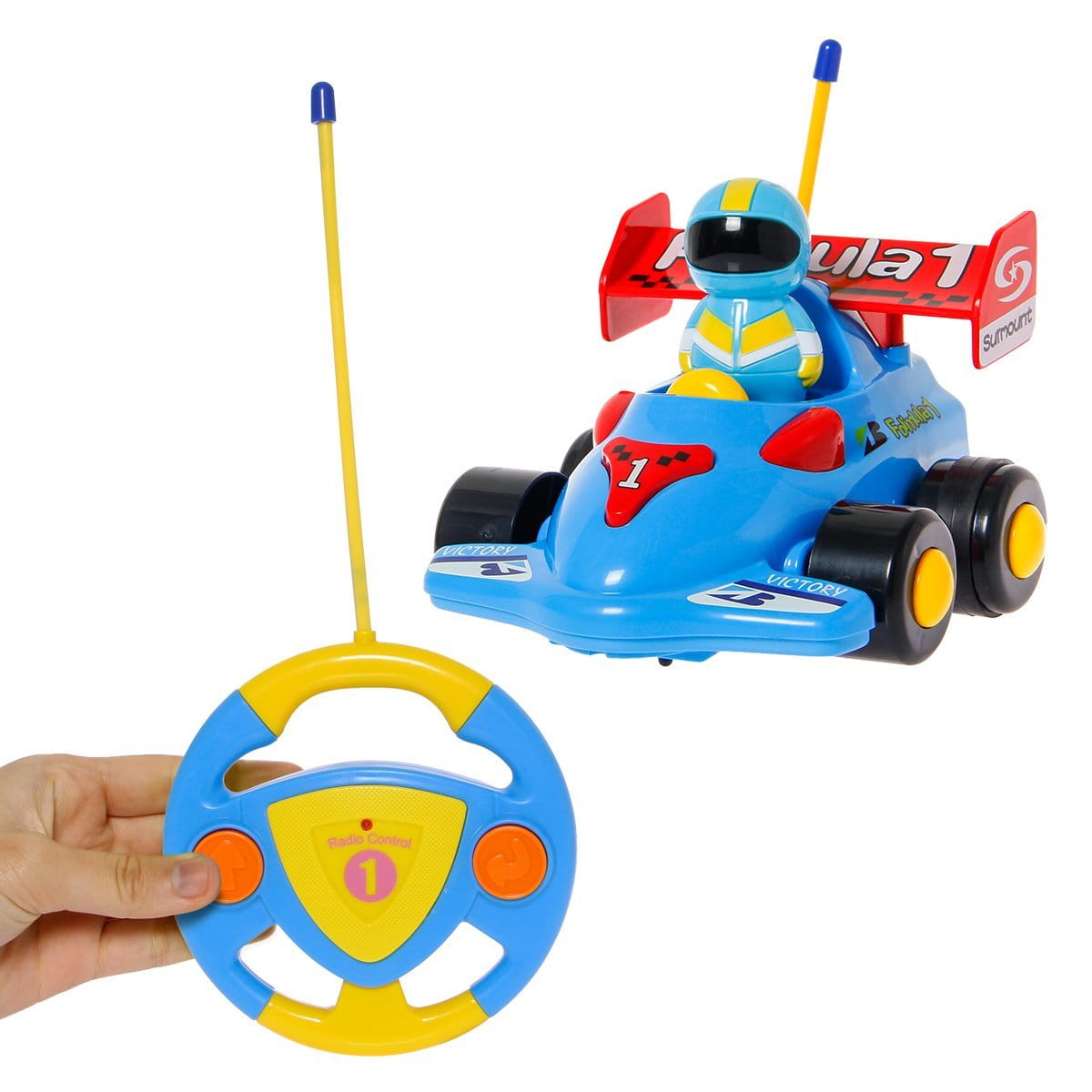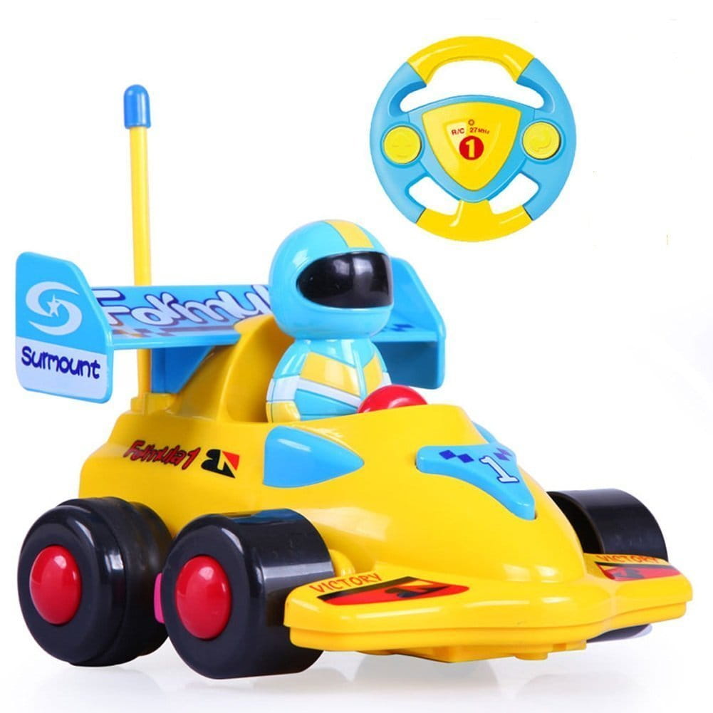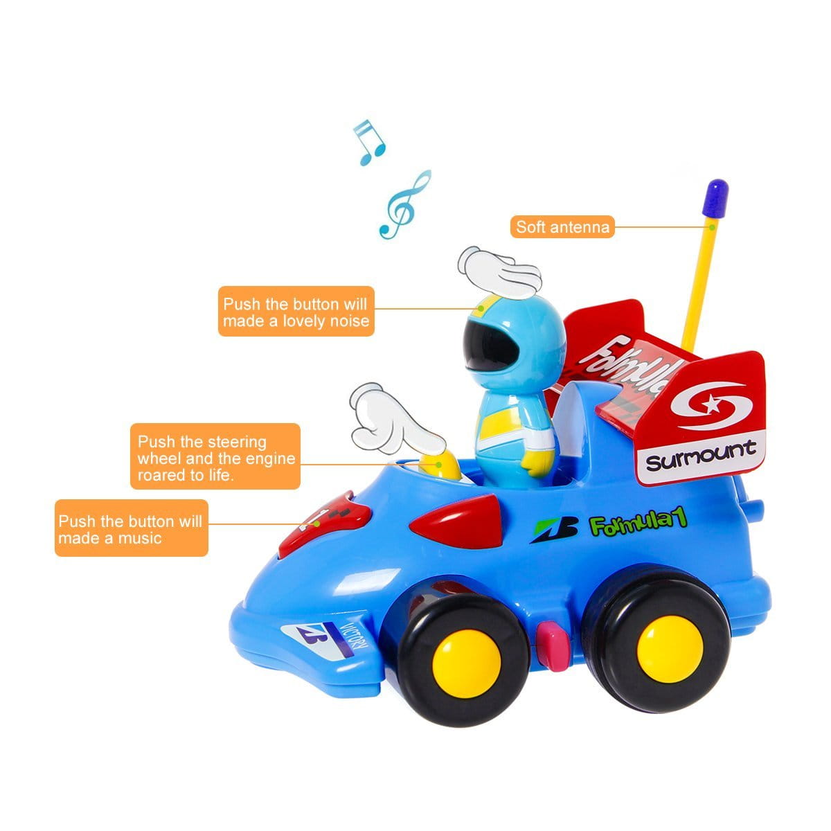 - Prosta obsługa: Intuicyjny pilot z dwoma przyciskami pozwala dziecku łatwo sterować zabawką.